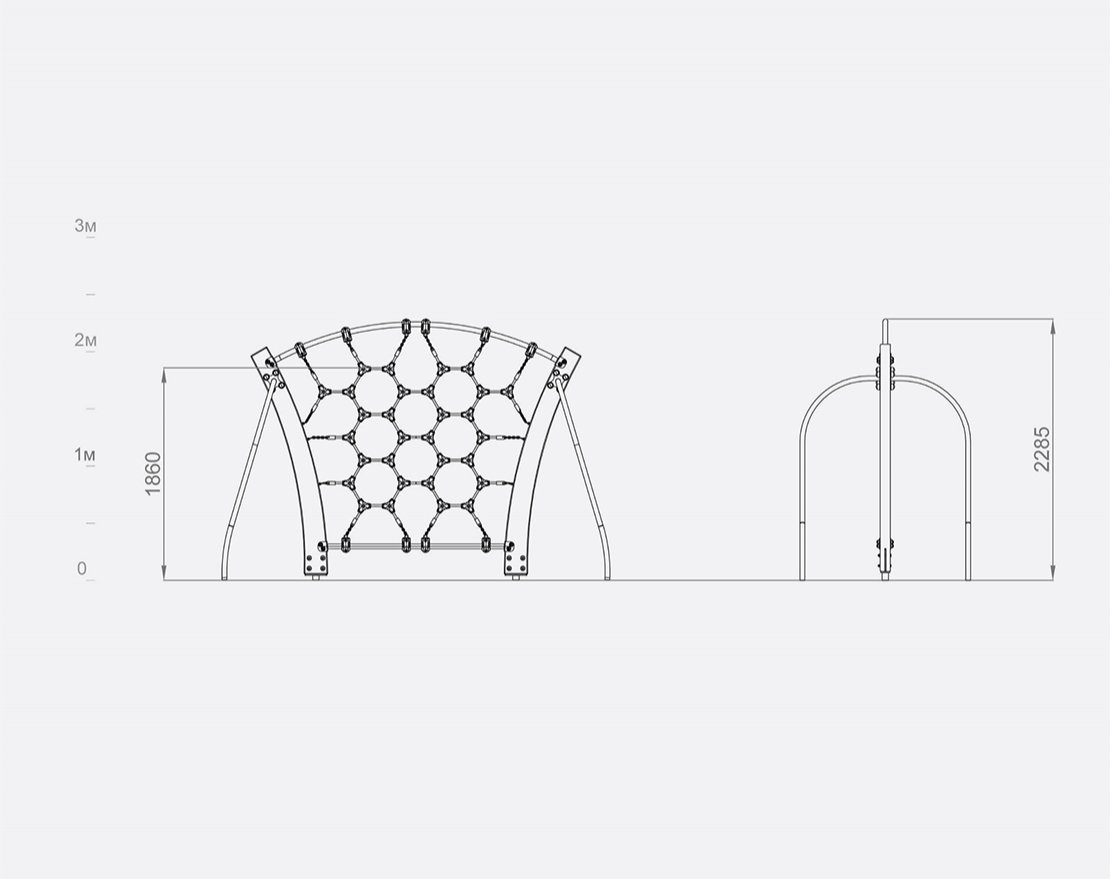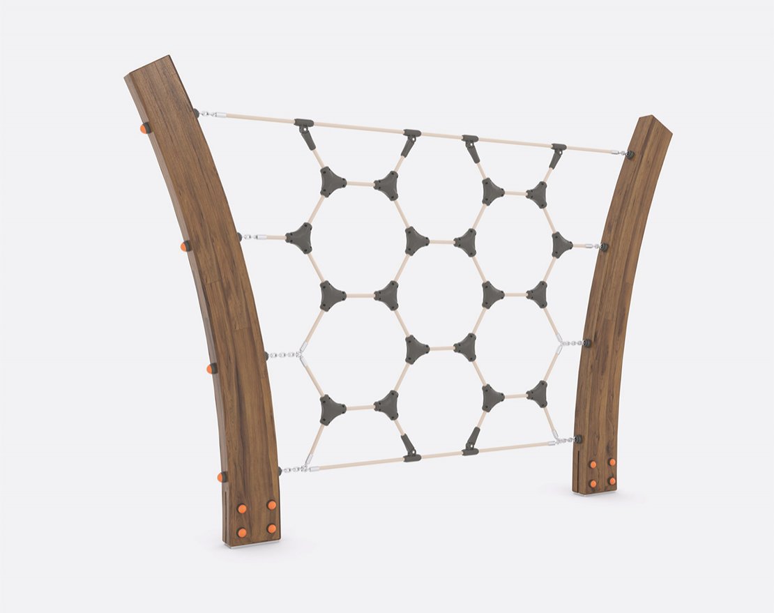 Состоит из опорных стоек и канатной сетки. Все крепежные элементы закрыты составными защитными колпачками.