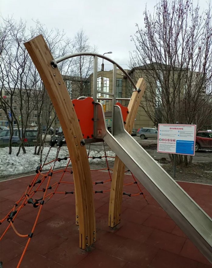 Состоит из опорных стоек, канатной сетки с пластиковыми уступами и металлической открытой горки с защитными бортиками. Все крепежные элементы закрыты составными колпачками.