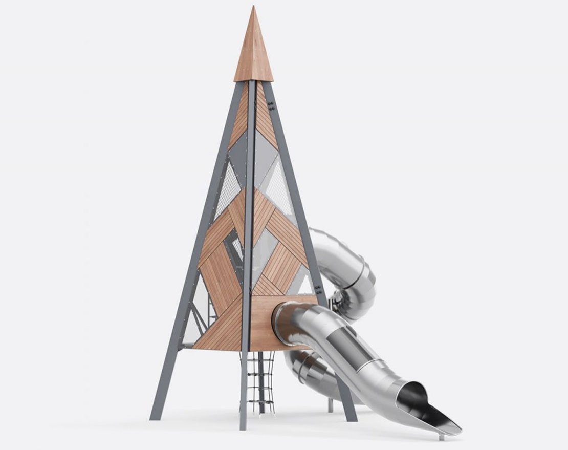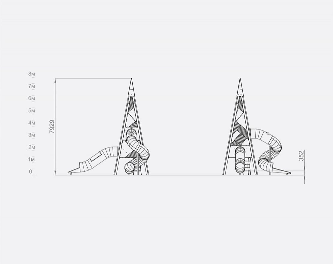 Состоит из металлического каркаса, пластиковых панелей, канатной лестницы и металлическими горками с защитными бортиками.