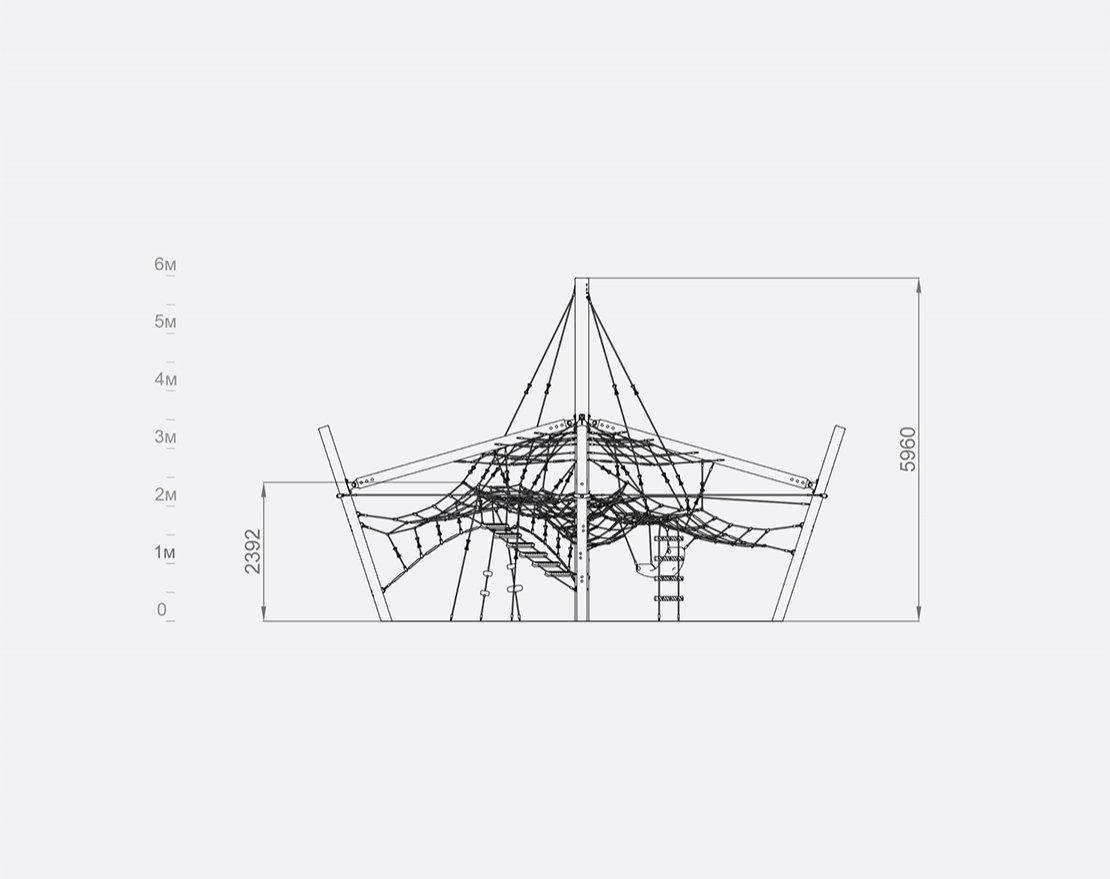 Состоит из опорных столбов и сетки с пластиковыми ручками-уступами. Конструкция также оснащена лестницами, скалодромными зацепами и канатными стропами.
