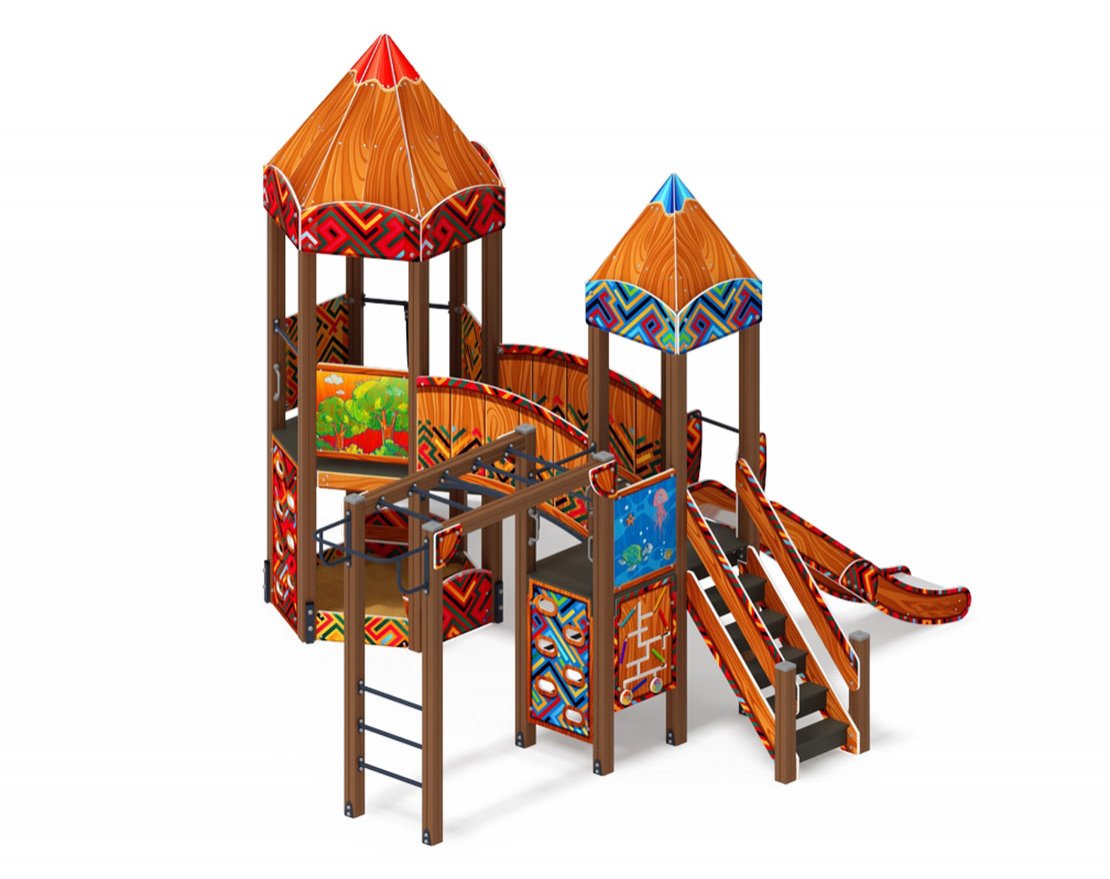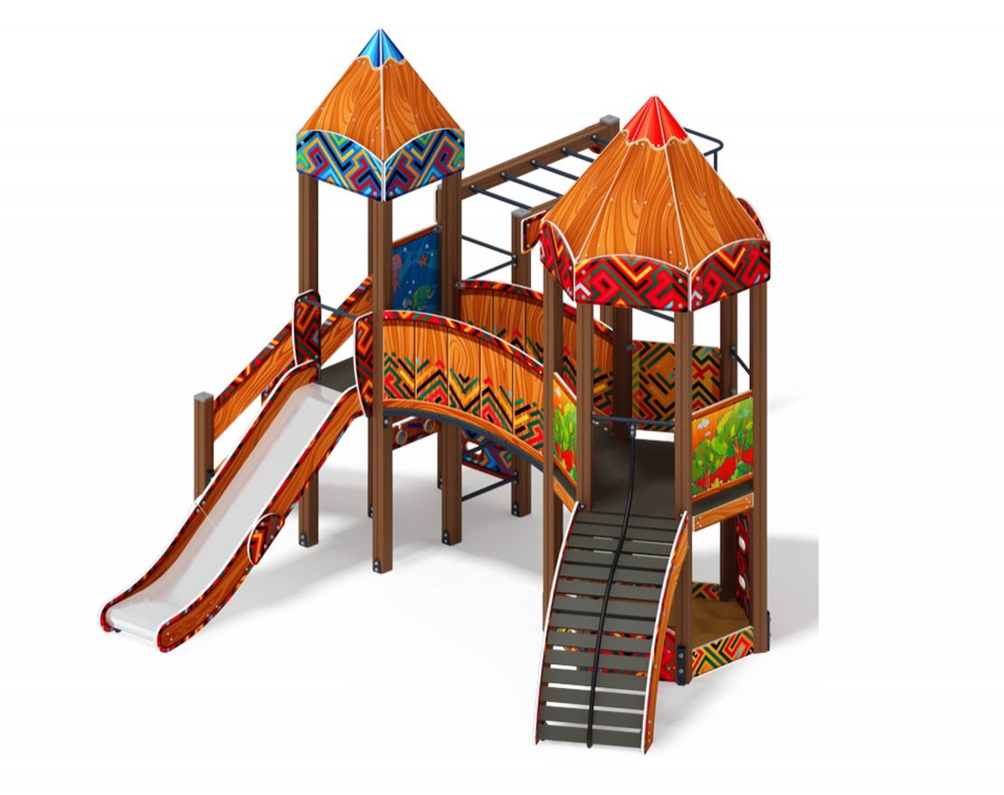 Спаренная башня из шести клеёных брусьев 100х100 мм высота 3000 мм-4 шт и 2200 мм- 2 шт; полы из ламинированной фанеры, с анти-скользящим покрытием 1460х780мм толщиной 18мм. Башня состоит из двух частей, над частью с горкой имеется четырёхскатная крыша из фанеры толщиной 12 мм, кромки фанеры тщательно шлифованы, фанера окрашена с нанесением принта. Башня украшена стилизованными декоративными арками (780х380х18мм) и четырехскатной крышей, крыша поставляется в сборе и выполнена из влагостойкой фанеры толщиной 12 мм (габариты в сборе 770х770х740мм), кромки фанеры тщательно шлифованы, окрашены с нанесением принта. Отметка пола башни от планировочной отметки площадки 1200. Высота башни 3740 мм.