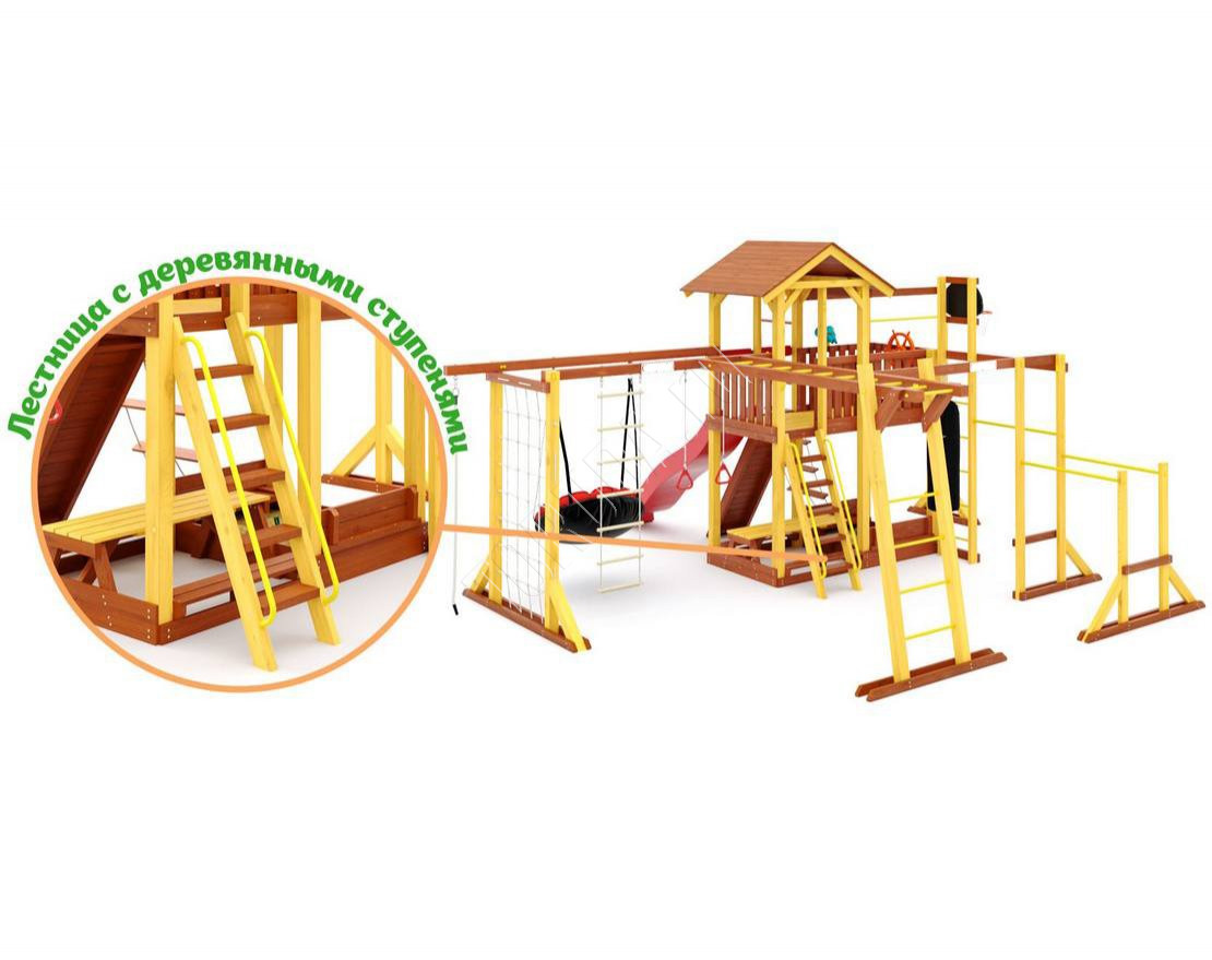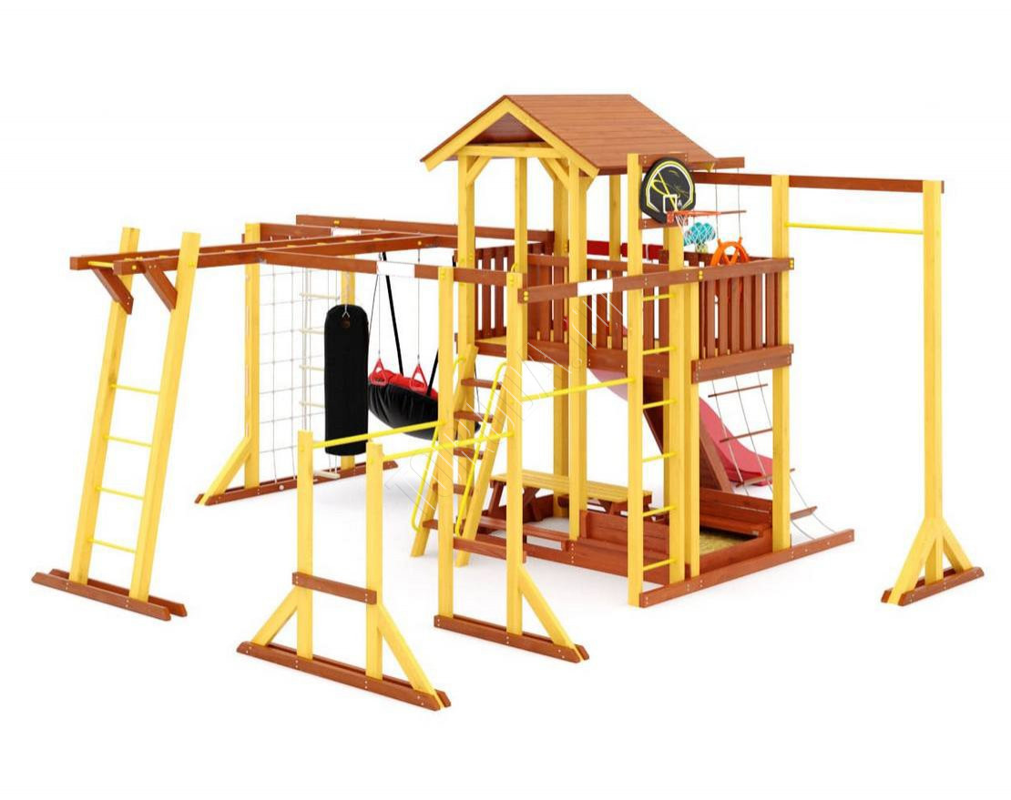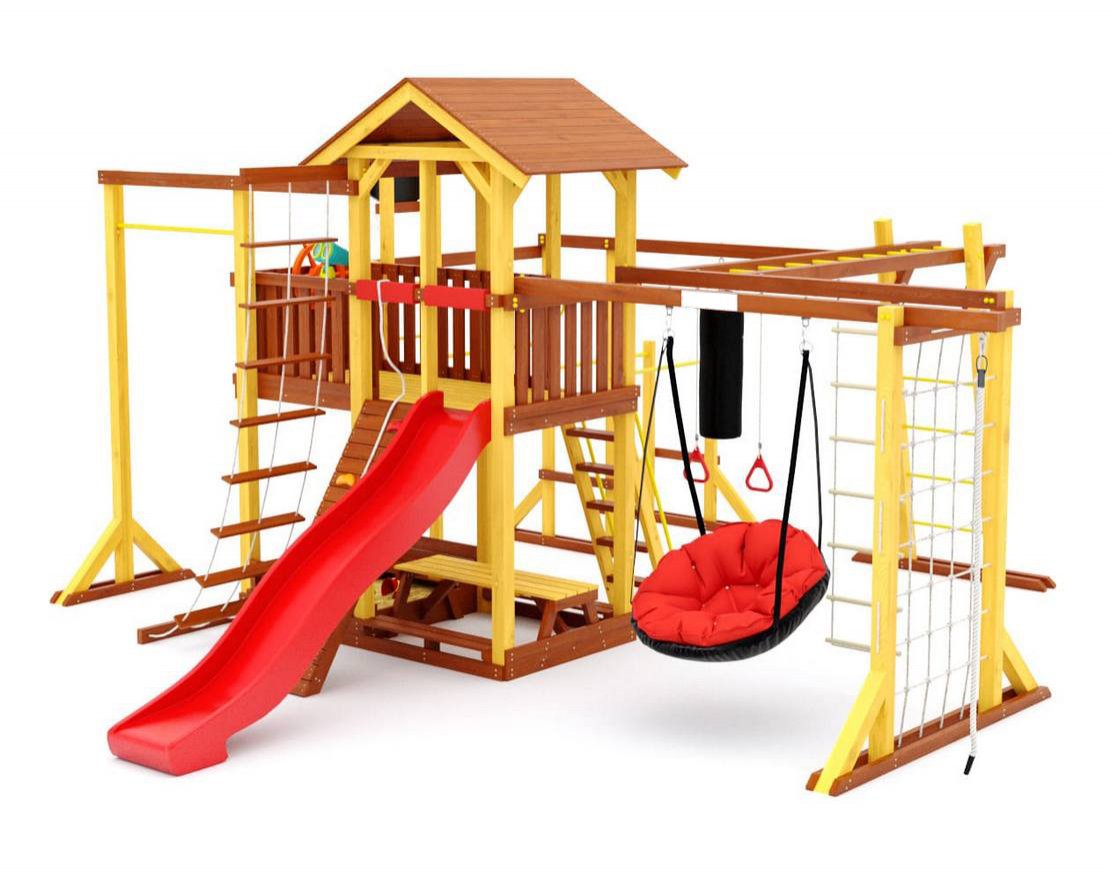 - Многообразие игровых элементов: в комплектацию входят скалодром, сетка-лазалка, турники, гимнастические кольца, песочница с крышкой, которая трансформируется в две лавочки, и многое другое.