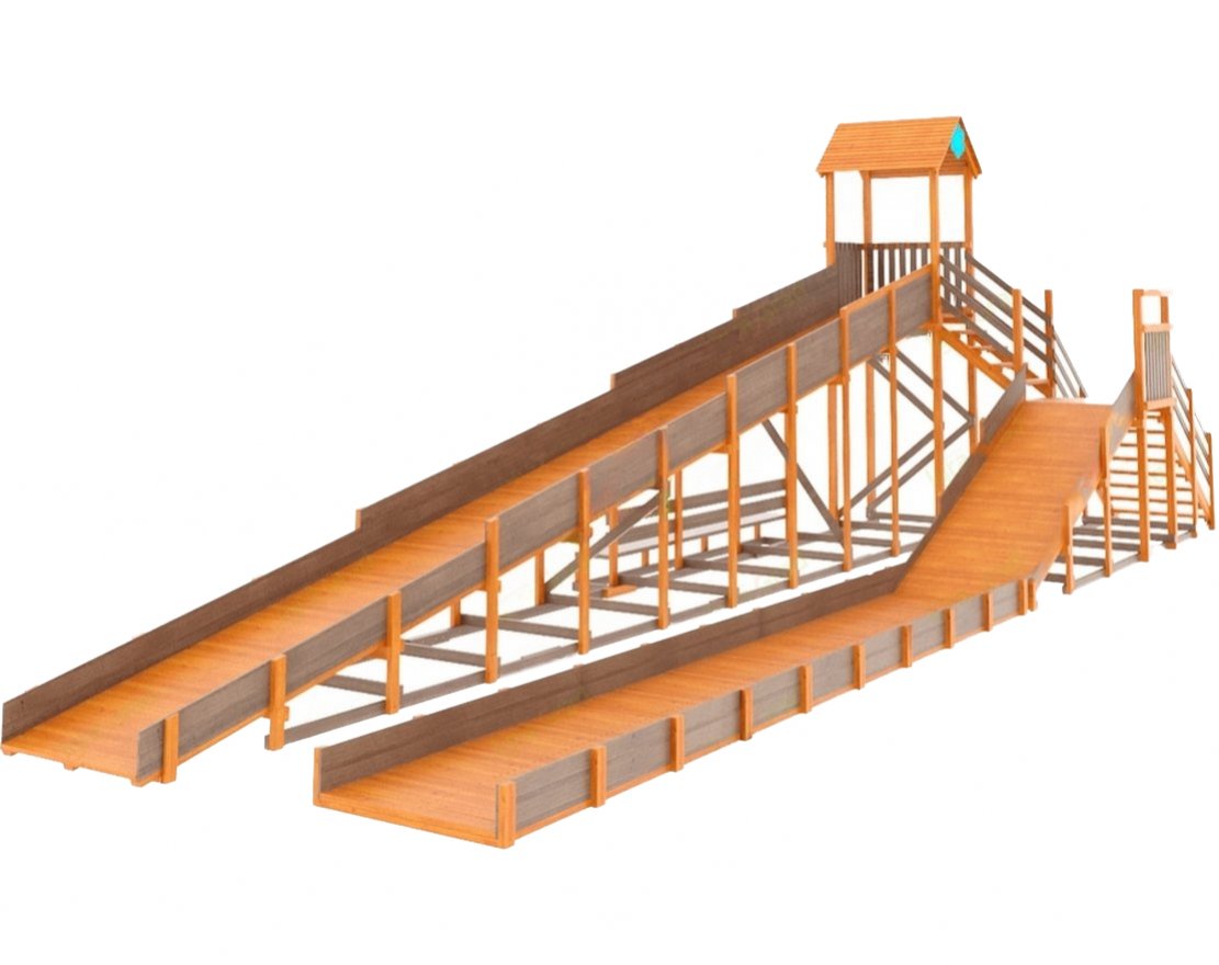 - Модуль безопасен для частного, общественного пользования и детей дошкольного возраста. Ведь конструкция оборудована бортиками, безопасными лестницами с перилами, усиленными балками. Имеется деревянная крыша, под которой можно спокойно ожидать своей очереди.