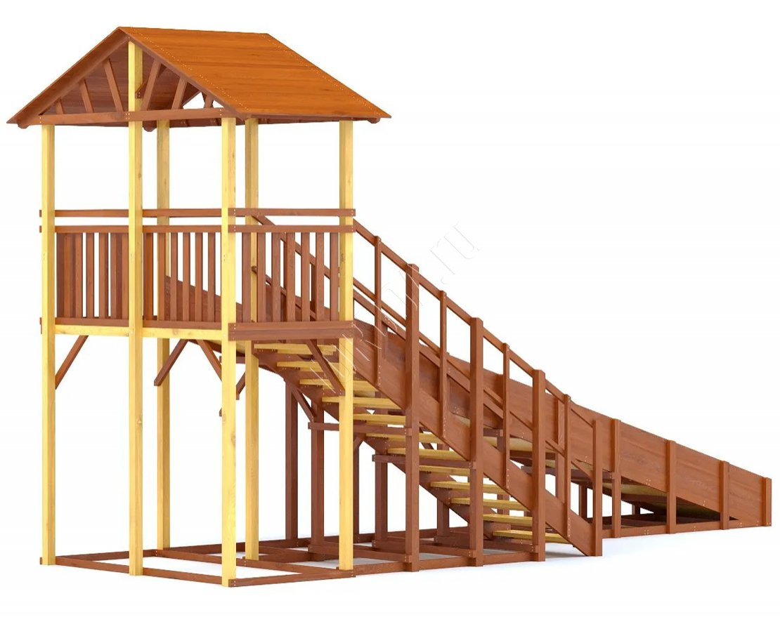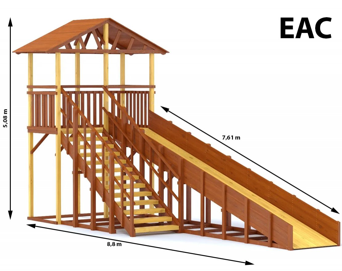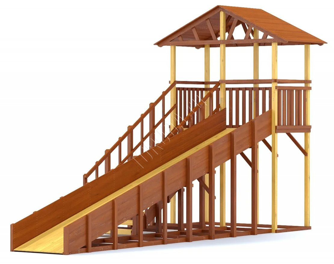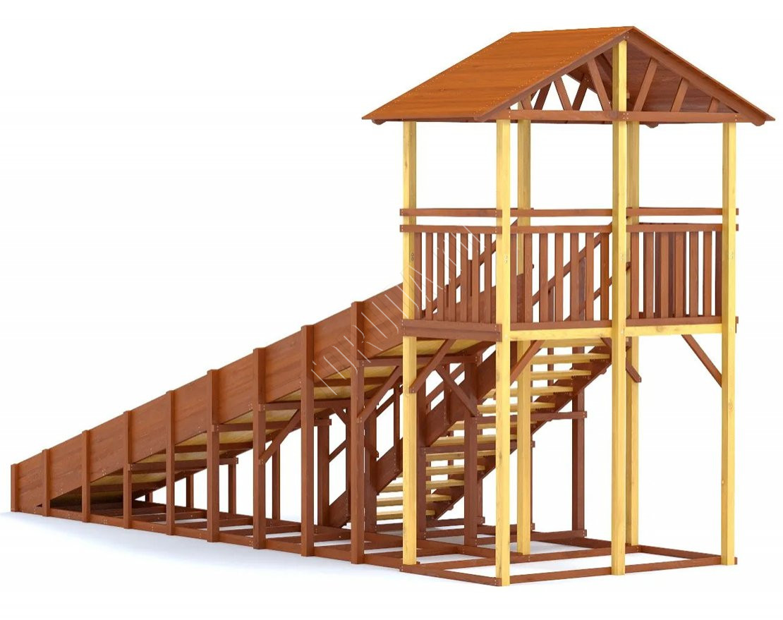 Конструкция тщательно спроектирована и выполнена из качественных материалов, что гарантирует безопасность и долгий срок службы. Каркас изготовлен из надежного клееного бруса, а в качестве защитного покрытия использован лакокрасочный состав с разрешающим сертификатом для применения на детских площадках.
