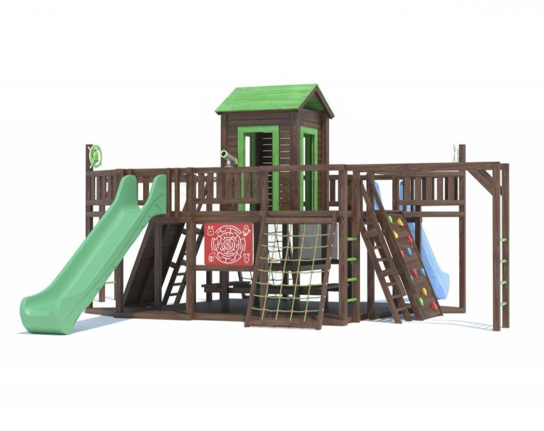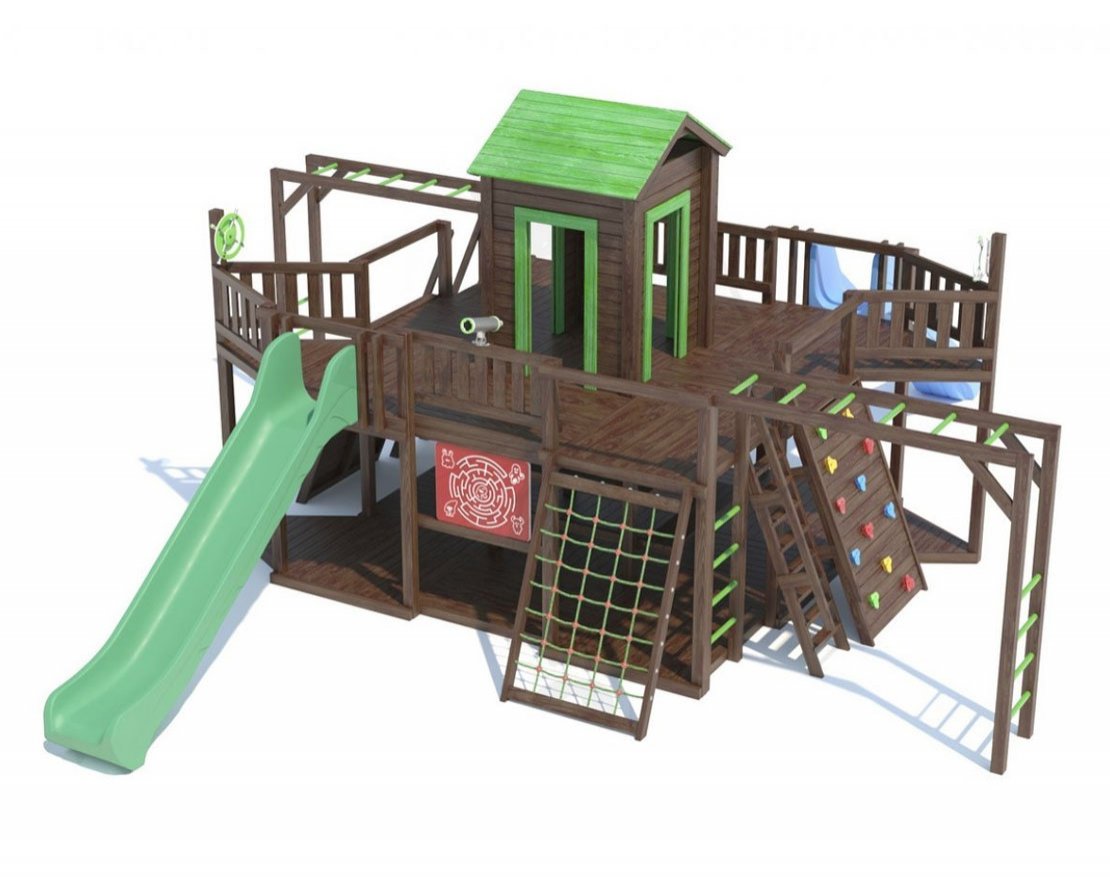 Основа детской игровой - спортивной конструкции – башня с платформой «серия К». Конструкция оснащена двухскатной деревянной крышей, встроенным полом, встроенным домиком в верхней части конструкции, встроенным столиком с лавками в нижней части конструкции, двумя пластиковыми антивандальными скатами с превосходной скользящей поверхностью, двумя «П»-образными деревянными рукоходами, двумя скалодромами, двумя канатными лестницами с армированным канатом, двумя деревянными лестницами, антивандальными пластиковыми игровыми панелями, штурвалами и телескопами. Для безопасности ребенка предусмотрены перила на лестнице, заборчики и ограждения над зонами препятствий (скат).