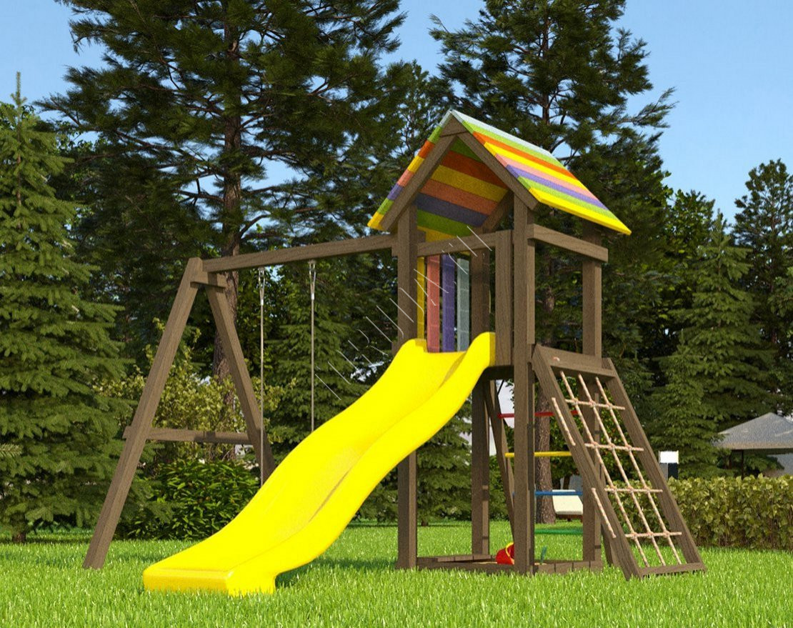 - Домик закрыт сверху деревянным перекрытием – оно скрывает от прямых солнечных лучей и позволяет передохнуть на свежем воздухе. Комплекс универсален, поскольку включает в себя столь любимые детьми горку и качели.