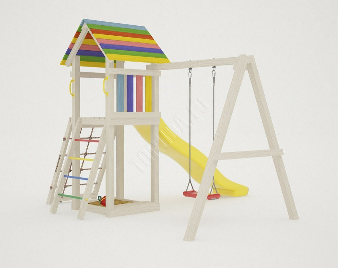 - Домик закрыт сверху деревянным перекрытием – оно скрывает от прямых солнечных лучей и позволяет передохнуть на свежем воздухе. Комплекс универсален, поскольку включает в себя столь любимые детьми горку и качели.