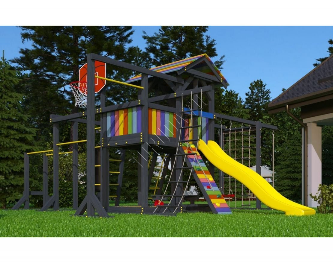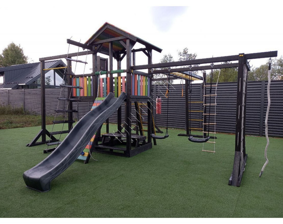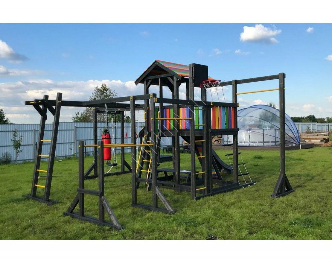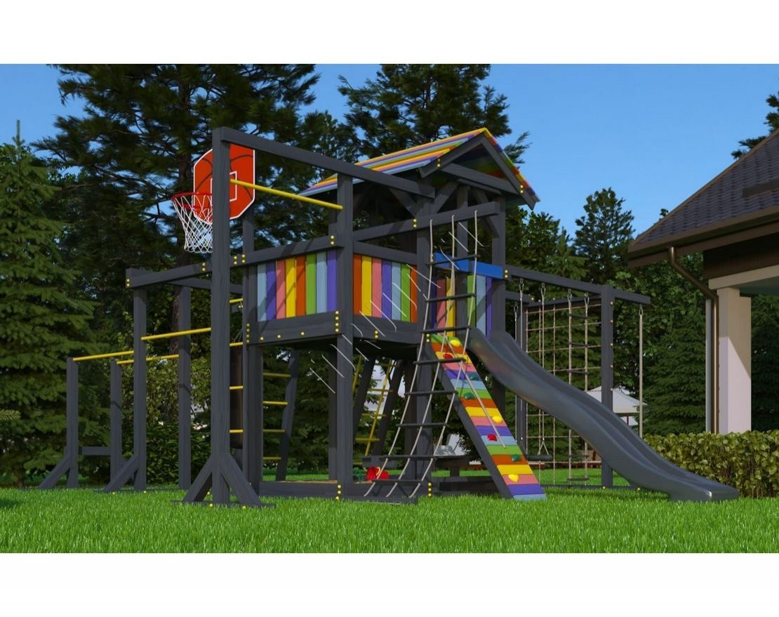 Детская площадка обладает довольно широким функционалом, предназначена для дачи, коттеджа.