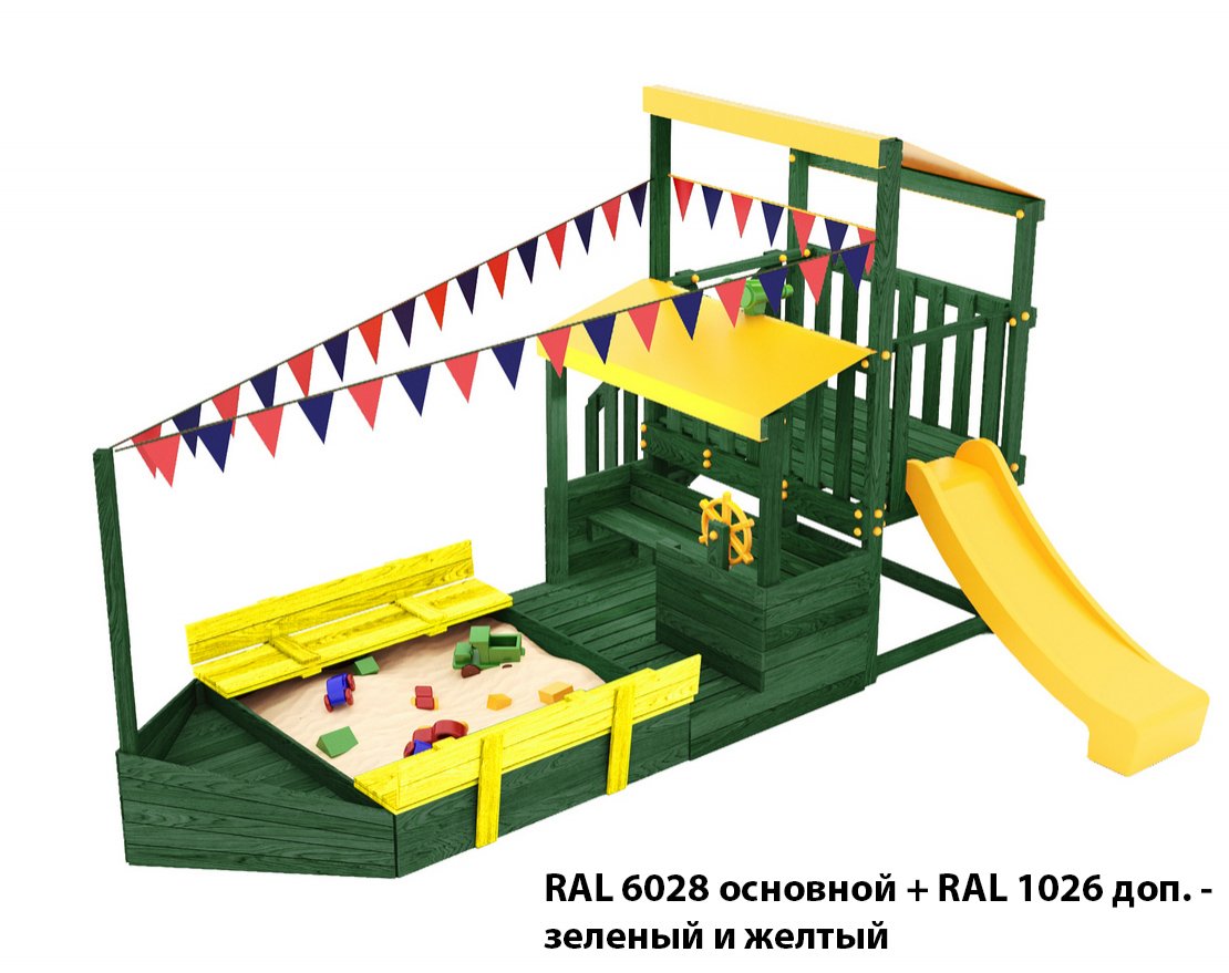 Детская песочница с крышками-лавочками и кораблик, включающий в себя штурманскую рубку и капитанский мостик с горкой с высоты 900 мм с флажками, а также две крыши закрытые тентом, чтобы можно было отправиться в дальнее плавание даже под дождем.
