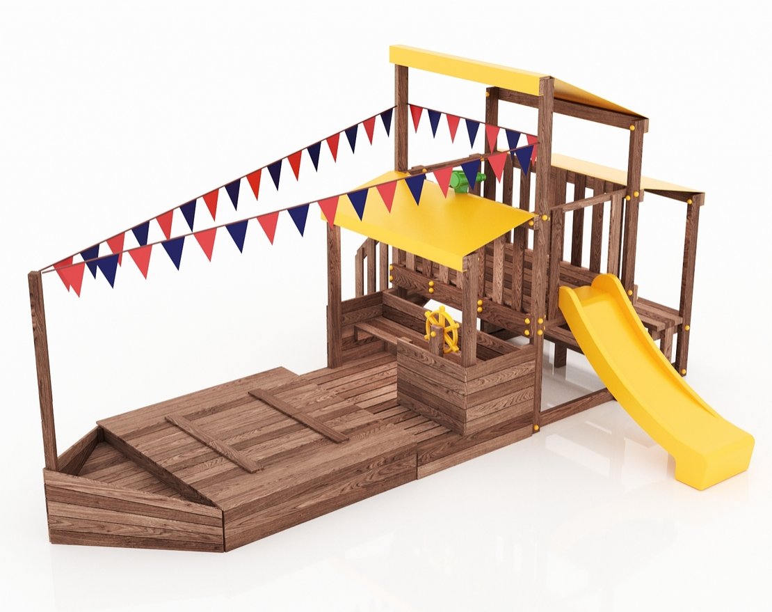 Детская песочница с крышкой-лавочкой и кораблик, включающий в себя штурманскую рубку и капитанский мостик с горкой с высоты 900 мм с флажками.