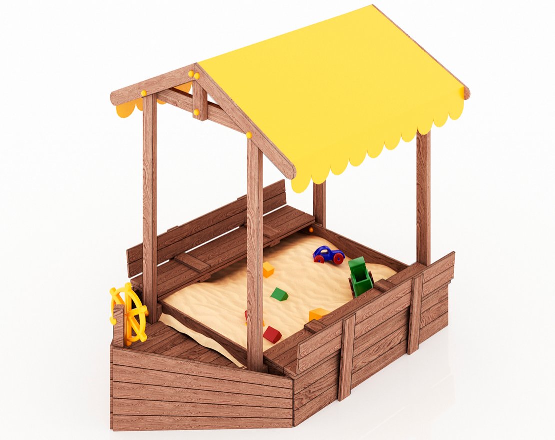 Детская складная песочница-кораблик с крышей, скамейками-лавочками и со штурвалом.