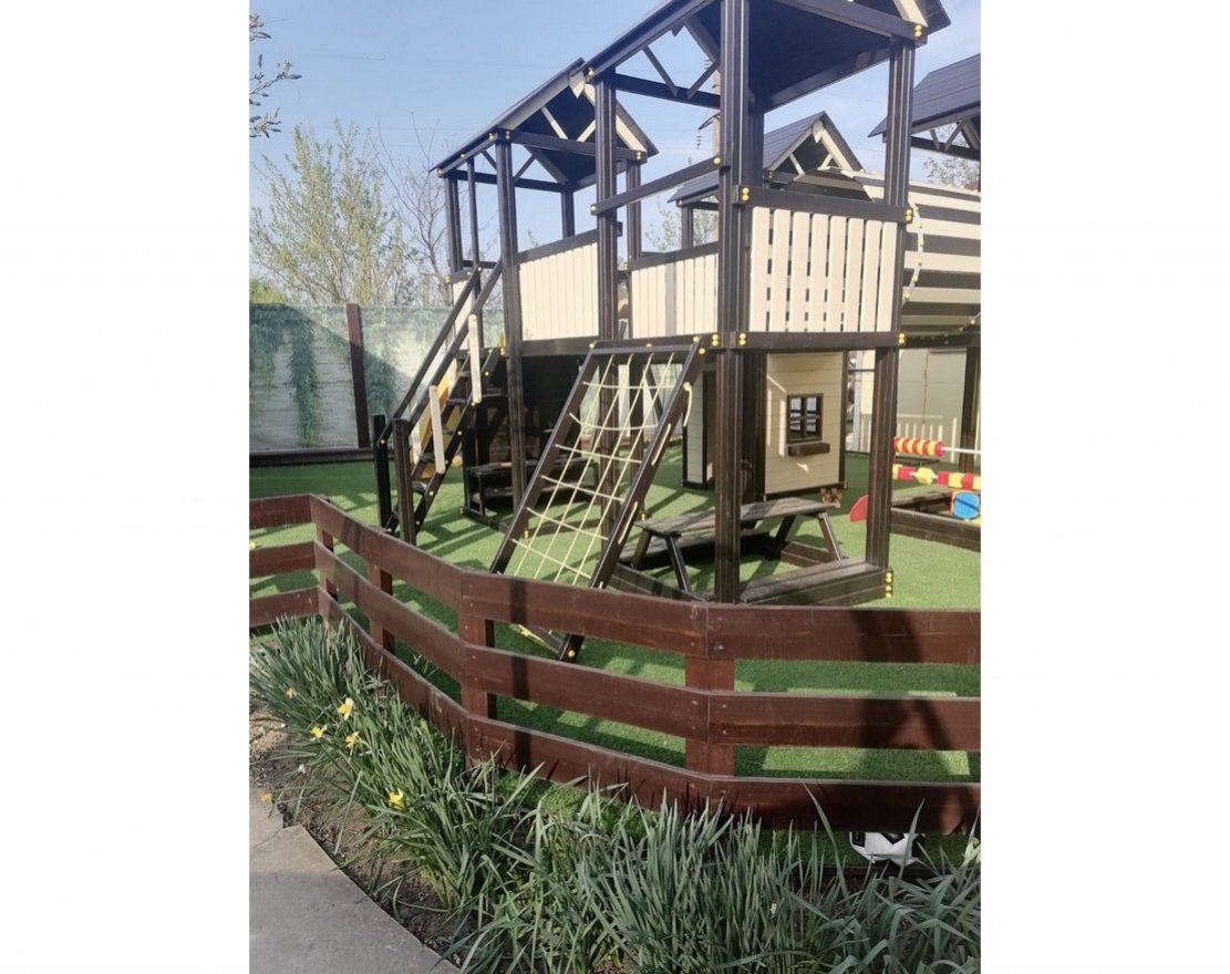 Изделие покрыто безопасной для детей высокоустойчивой пропиткой на водной основе, которая надежно защищает древесину от воздействия окружающей среды. Перила, скалодром и лестница производятся по системе "шип-паз".
