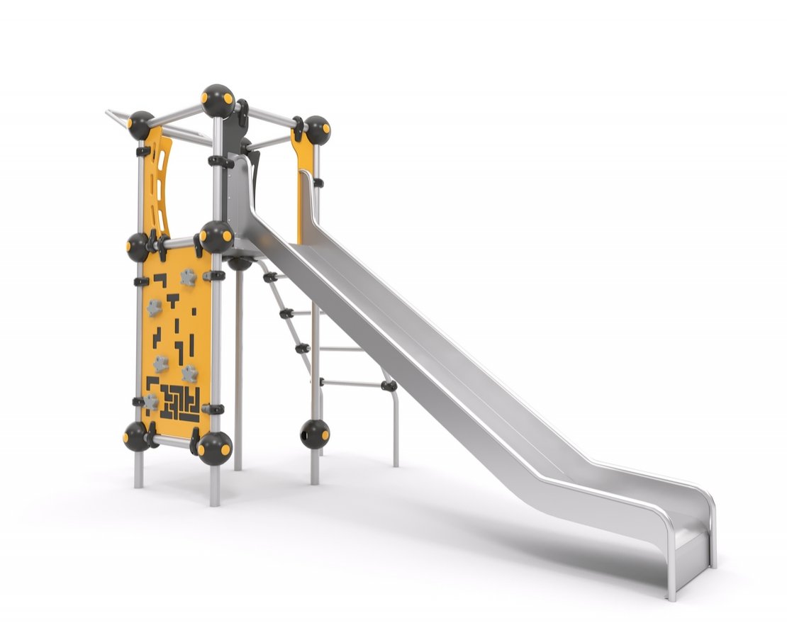 Представляет собой небольшую конструкцию, состоящую из открытой прямой горки с защитными бортиками, скалодромной панели, вертикальной трубы и металлической лестницы.