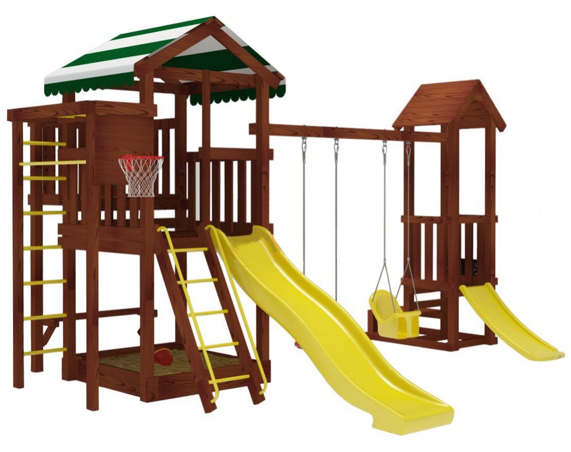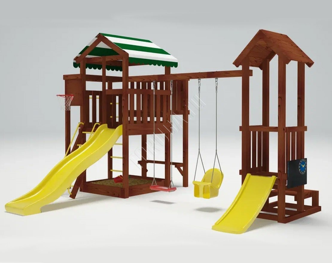 - Устойчивость к погодным условиям: игровые башни с крышей защищают от солнца и осадков, а материалы комплекса рассчитаны на долгий срок службы без сложного ухода.