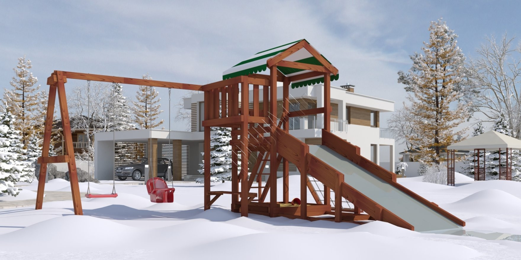 Сбоку к башне крепится качельная рама для двух элементов на выбор, например, качели «Лодочка» и «Люкс» со спинкой. Они очень нравятся как маленьким деткам, так и младшим школьникам.