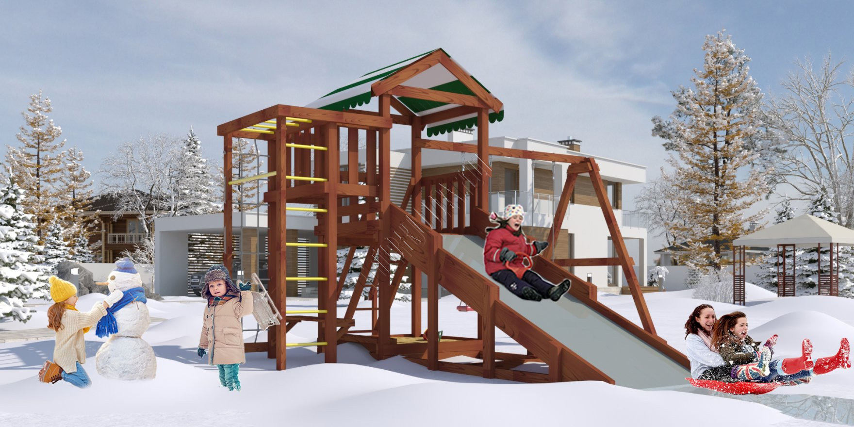 Конструкция сертифицирована и безопасна. Крепежи скрыты под хорошо закрепленными заглушками – поэтому даже малыши не поранятся. Каркас состоит из натуральных деталей – клееного бруса квадратного сечения со стороной 75 мм. Во избежание получения заноз и ссадин дерево отшлифовано, а края скруглены.