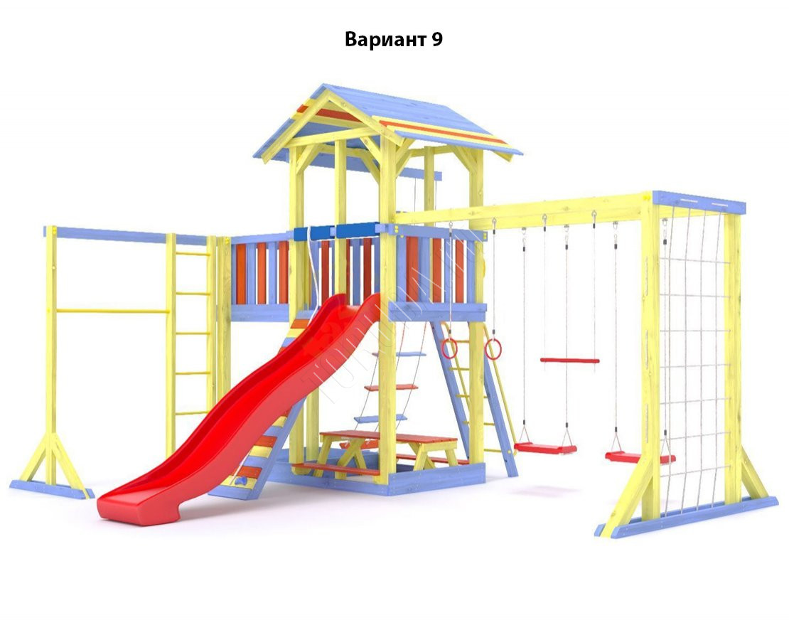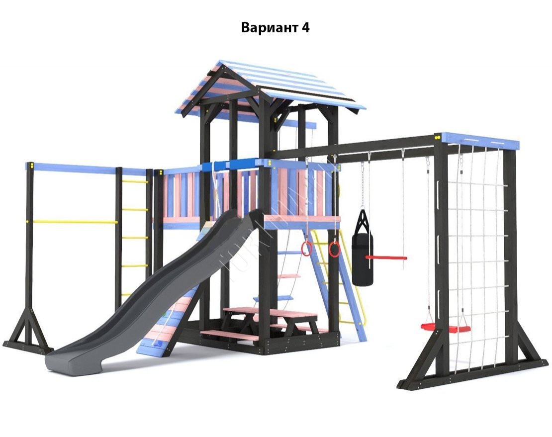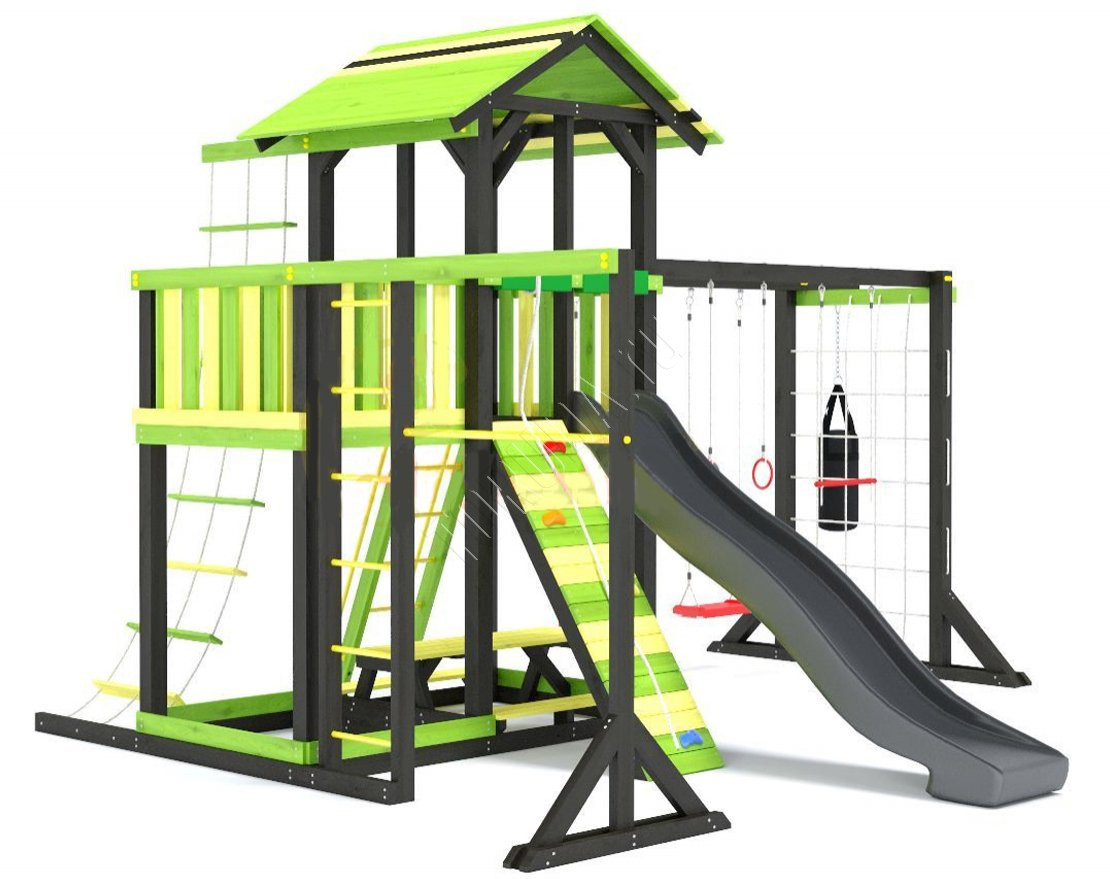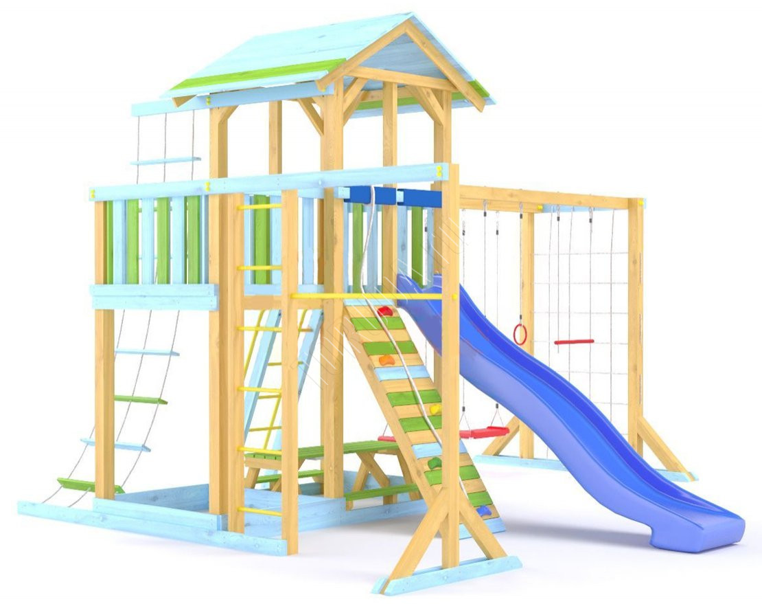 - Комплектующие игровой площадки изготовлены из всесезонного пластика и клееного бруса повышенной прочности, что обеспечивает полную безопасность и вместе с тем прочность и долговечность конструкции.