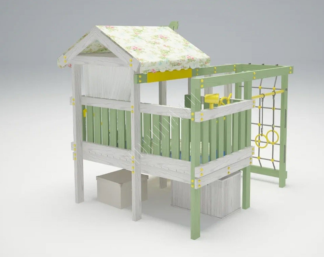 - Модель включает в себя три объединенных зоны: домик на платформе высотой 60 см, балкон и спортивный комплекс. Пространство под детской площадкой позволит хранить небольшие ящики. Ребёнок может положить туда мягкие игрушки, машинки, мячи и прочие предметы.