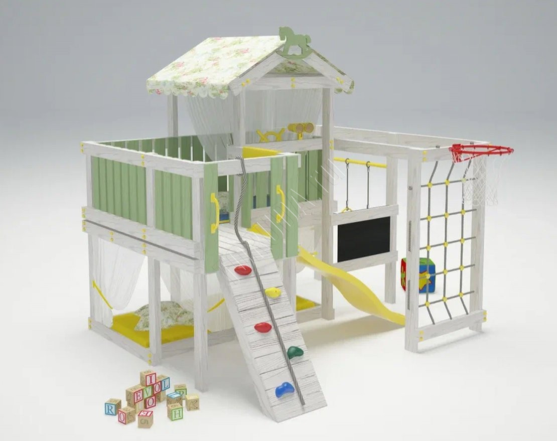 - Основа модульной конструкции – домик. Высота от поверхности пола до платформы составляет 90 см. Взобраться туда непросто. Сделать это можно только по мини-скалодрому. Для облегчения задачи добавили удобный канат. Подъём станет хорошей тренировкой для мышц мальчиков и девочек. Слезать со второго этажа легче. Ребёнок может скатиться по горке. Её длина 175 см.
