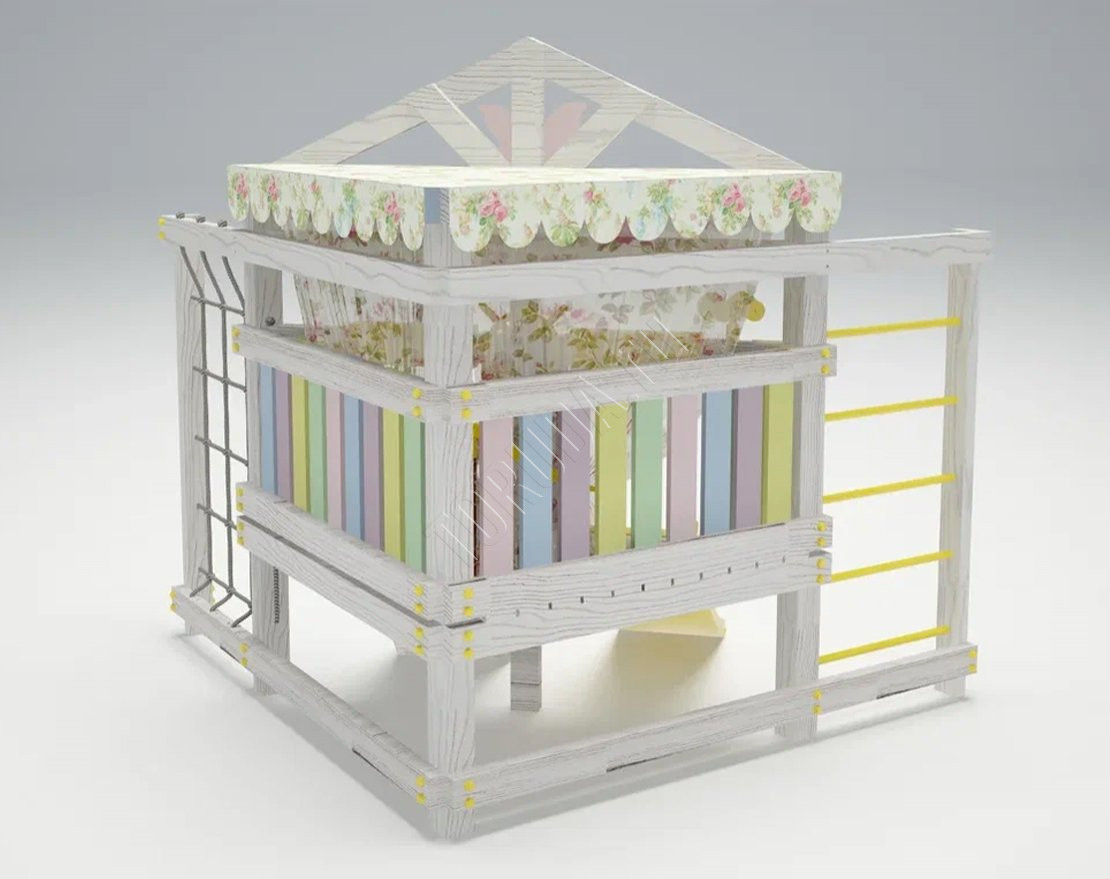 Главная часть игрового комплекса – уютный домик под крышей. В него можно забраться по скалодрому, держась за канат. Там можно отдохнуть, поиграть и порулить за штурвалом. А потом весело спуститься с горки! Также дети могут позаниматься на шведской стенке или полазать по канатной сетке, тренируя ловкость, силу рук и выносливость организма.