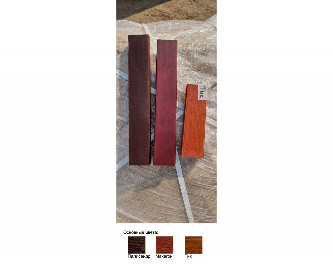 Сиденье и спинка: Брус из хвойных пород древесины. Покрытие - атмосферостойкая лессирующая акриловая пропитка с лаком. Стандартные цвета: Палисандр, Махагон, Тик.