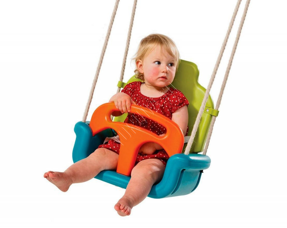 Детские качели изменяются по мере роста ребёнка от детской версии с дополнительными страхующими элементами до стандартного сиденья для качелей. Более того, задняя спинка имеет два положения. Продукт имеет страховой ремень с пряжкой, которая кликает во время срабатывания. Кольца и восьмёрки изготовлены из оцинкованной стали. Уэлды на верёвке изготовлены из чёрного пластика.